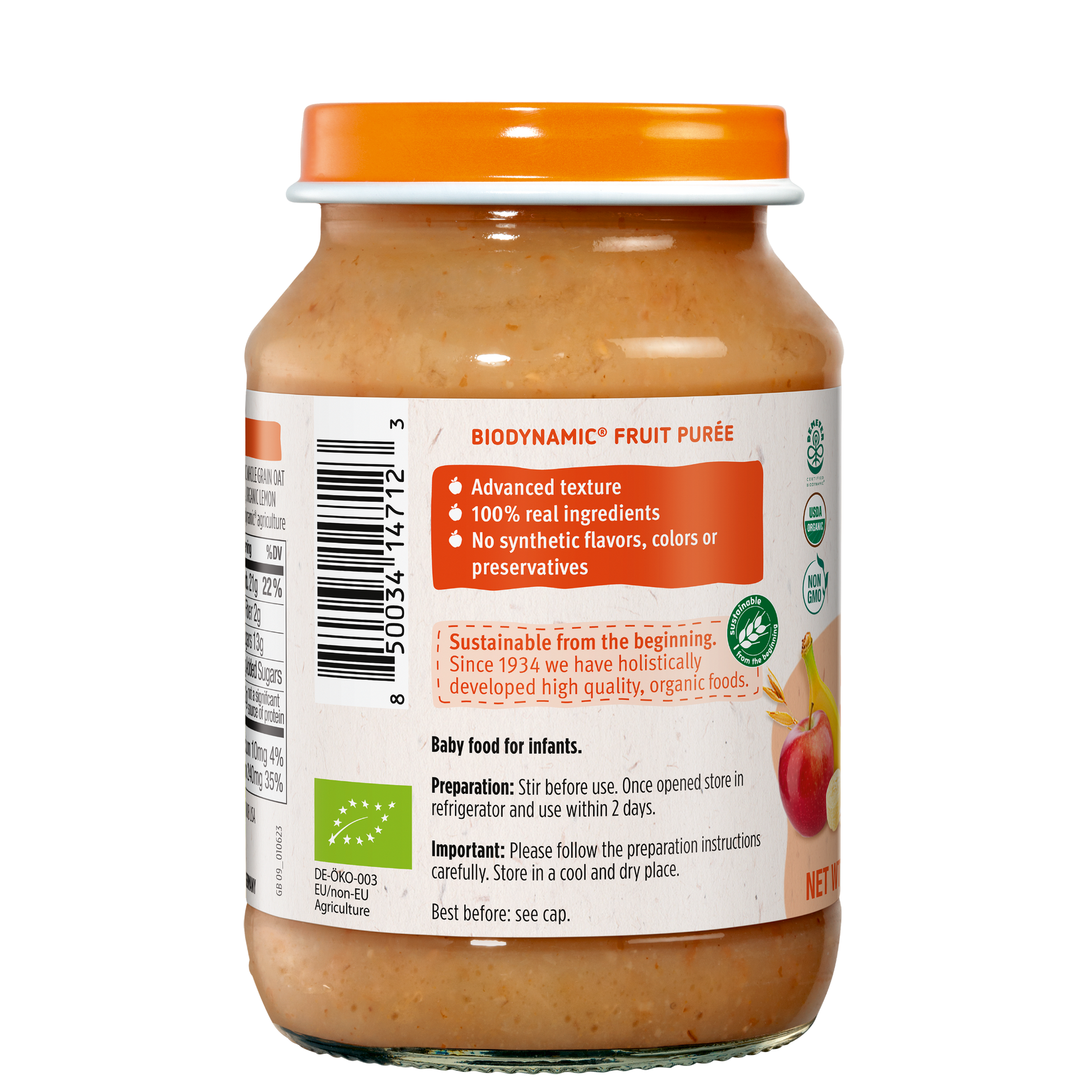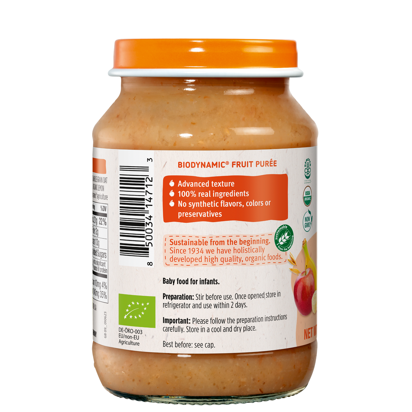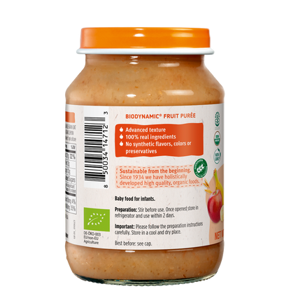 Mixed Fruit with Muesli Baby Food Jars are made with USDA organic, non-GMO, Demeter-certified biodynamic ingredients. The finely puréed fruit and grains are easy to digest and an ideal addition to a balanced meal. With its resealable lid, you can store it in the fridge for up to 2 days after opening. Holle's Organic Mixed Fruit with Muesli Baby Food Jars are a tasty option for weaning babies 8 months and up.